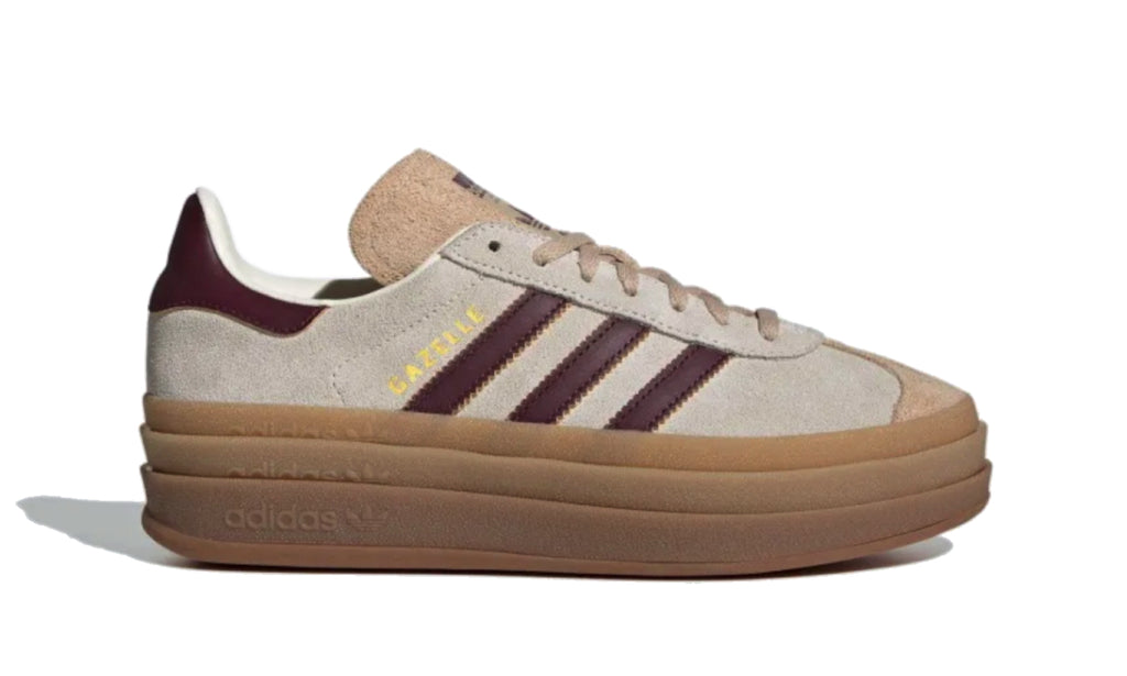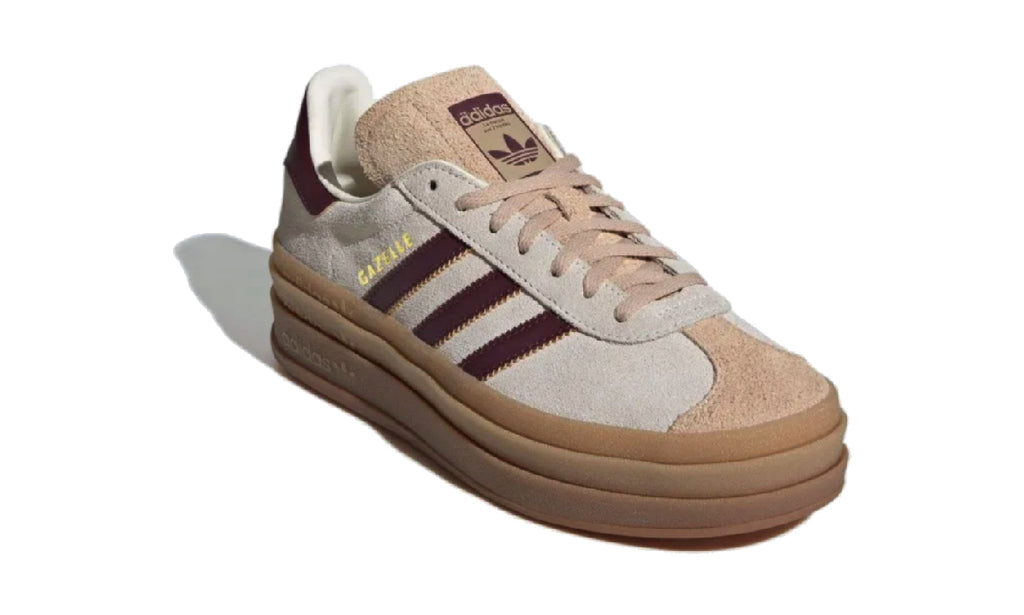 adidas Gazelle Bold Cream Maroon presenta una parte superior de gamuza de color crema con superposiciones texturizadas de color marrón claro en la puntera y la lengüeta.