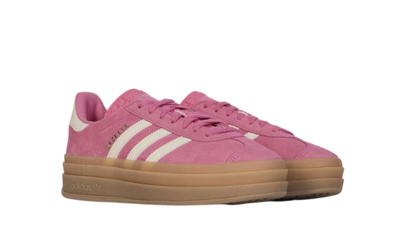 adidas Gazelle Bold presentan un diseño renovado que rinde homenaje al icónico modelo Gazelle. Esta versión destaca por su suela gruesa de goma en color beige, lo que aporta mayor comodidad y un toque de modernidad al estilo clásico. La parte superior está hecha de gamuza suave en un tono rosa vibrante, combinado con las clásicas tres franjas blancas, creando un contraste atractivo y fresco. El logotipo dorado "Gazelle" en el lateral aporta un detalle elegante que resalta sobre el fondo.