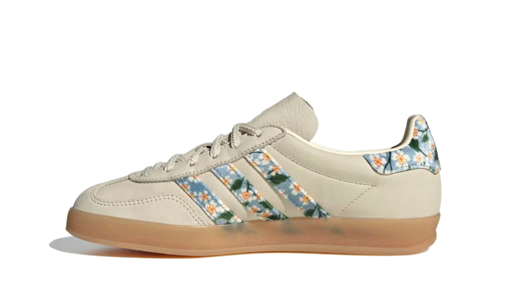 La Liberty London x adidas Gazelle Indoor “White Multi” celebra los 150 años de la icónica casa británica con un toque artístico y elegante. El diseño presenta un delicado estampado floral en las 3 Franjas y el talón, sobre una base de nobuk blanco hueso que resalta los detalles coloridos. Los logotipos dorados de Gazelle y el co-branding interior reflejan la fusión entre lujo y herencia deportiva. La suela de goma translúcida ofrece tracción y un acabado clásico, mientras que los cordones extra azules y el envoltorio floral completan esta colaboración exclusiva.