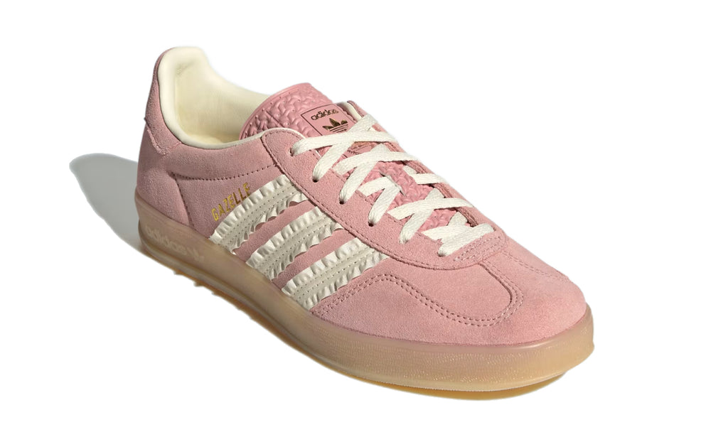 Nacida en el campo y reinventada para la calle, la adidas Gazelle Indoor Ruffle Stripes "Pink" da un giro fresco y divertido a la clásica zapatilla de los años 70. Esta versión, con suave gamuza rosa pastel, sustituye lo tradicional por texturas rizadas en las 3-Stripes y la lengüeta, dándole un toque artesanal sin perder su esencia. Los cordones blancos y el logo dorado "GAZELLE" mantienen el estilo clásico, mientras que la suela de goma semitranslúcida ofrece el agarre retro que la hace única.