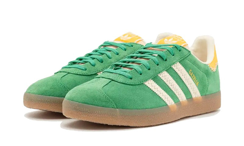 Adidas Gazelle Preloved Green presenta en una parte superior de gamuza verde Preloved con lengüetas de talón de cuero Semi Spark. Las 3 rayas de cuero en blanco roto descansan en los paneles laterales, complementando la marca "Gazelle" dorada en la pared lateral exterior. Las costuras blancas de gran tamaño en la parte trasera y la lengüeta Ecotex agregan profundidad al diseño de la zapatilla de terraza favorita de los fanáticos, mientras que el logotipo clásico del trébol de adidas hace un guiño a su herencia deportiva.