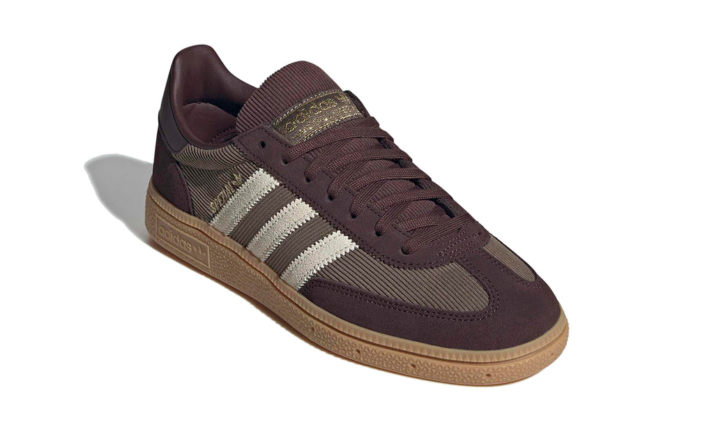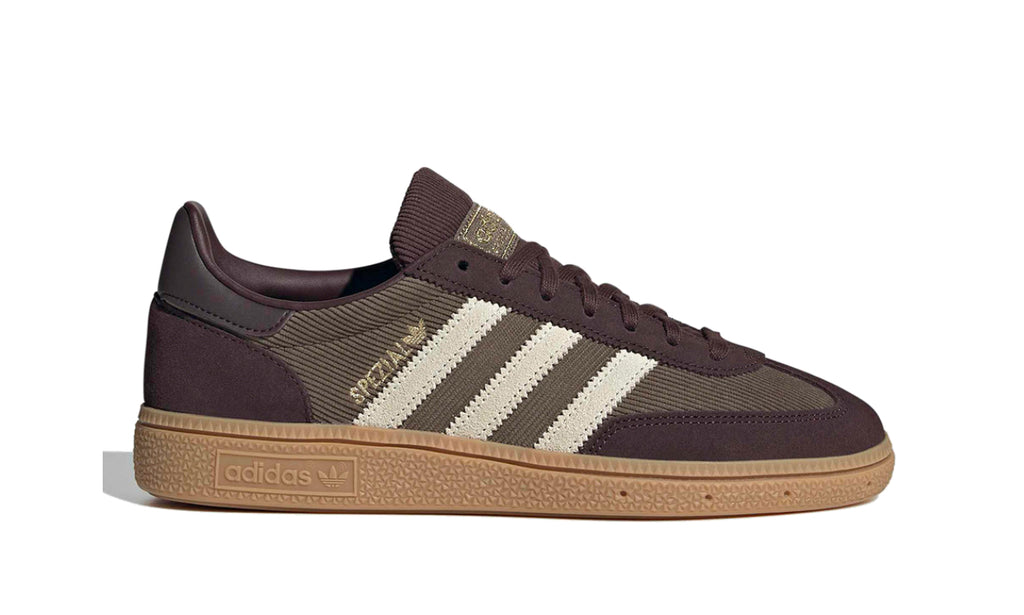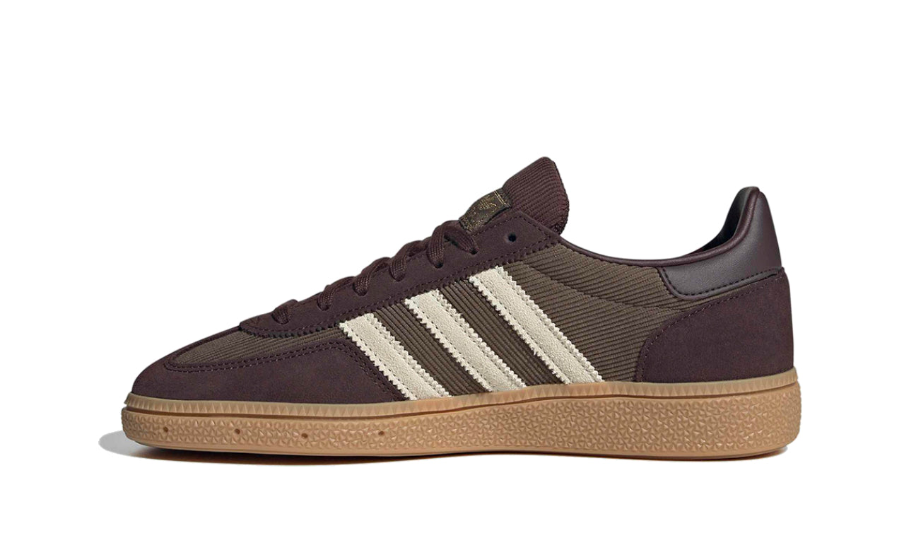 adidas Handball Spezial en su versión color marrón combinan elegancia y estilo retro con un toque moderno. La parte superior de estas zapatillas está compuesta por gamuza de alta calidad y detalles en cordura, ofreciendo una estética única que resalta por su tonalidad marrón, acompañada de las clásicas franjas en color crema. El logotipo dorado en el lateral y la etiqueta dorada en la lengüeta le dan un acabado premium. La suela de goma en color caramelo no solo aporta un agarre excepcional, sino que también complementa perfectamente el diseño vintage de este modelo.