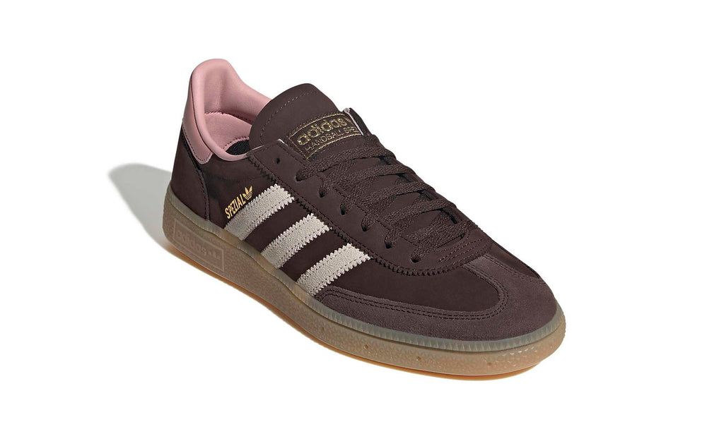 La adidas Handball Spezial "Brown Pink" combina el estilo clásico de los años 70 con un toque moderno y elegante. Su parte superior de ante marrón oscuro se complementa con las tres franjas en tono beige claro y un forro interior rosa suave que aporta contraste y frescura. El logotipo dorado Spezial añade un detalle retro distintivo, mientras que la suela de goma translúcida ofrece tracción y un aire vintage. Perfecta para el día a día, esta silueta mantiene la esencia deportiva con un acabado sofisticado y versátil.