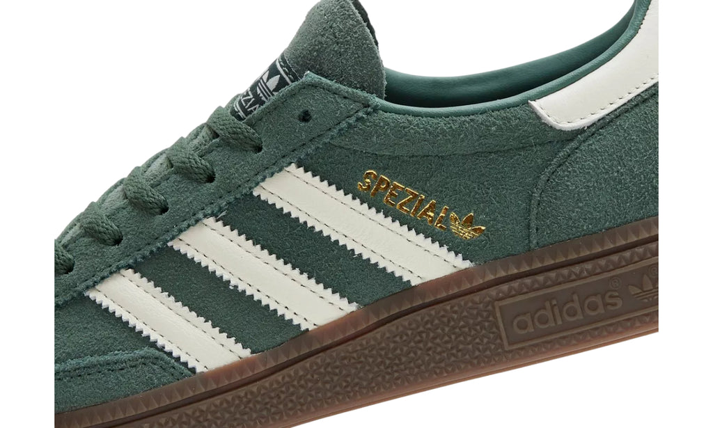 Las Adidas Handball Spezial en color verde aportan un toque fresco y retro a cualquier conjunto. Confeccionadas en gamuza premium, destacan por su rica tonalidad verde combinada con las clásicas tres franjas blancas y una suela de goma en marrón que brinda tracción y durabilidad. El logotipo “Spezial” en dorado añade un detalle distintivo que refleja su herencia deportiva.