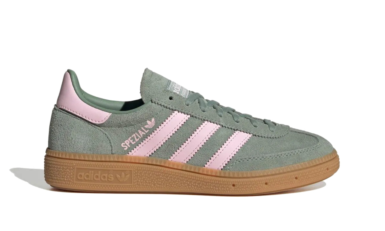adidas Handball Spezial combina el legado deportivo con un estilo fresco y contemporáneo. Su parte superior de ante verde menta se complementa con las tres franjas rosadas y detalles en el talón del mismo tono, aportando un contraste suave y elegante. La clásica suela de goma color caramelo mantiene la esencia retro del modelo original, ofreciendo tracción y comodidad en cada paso.