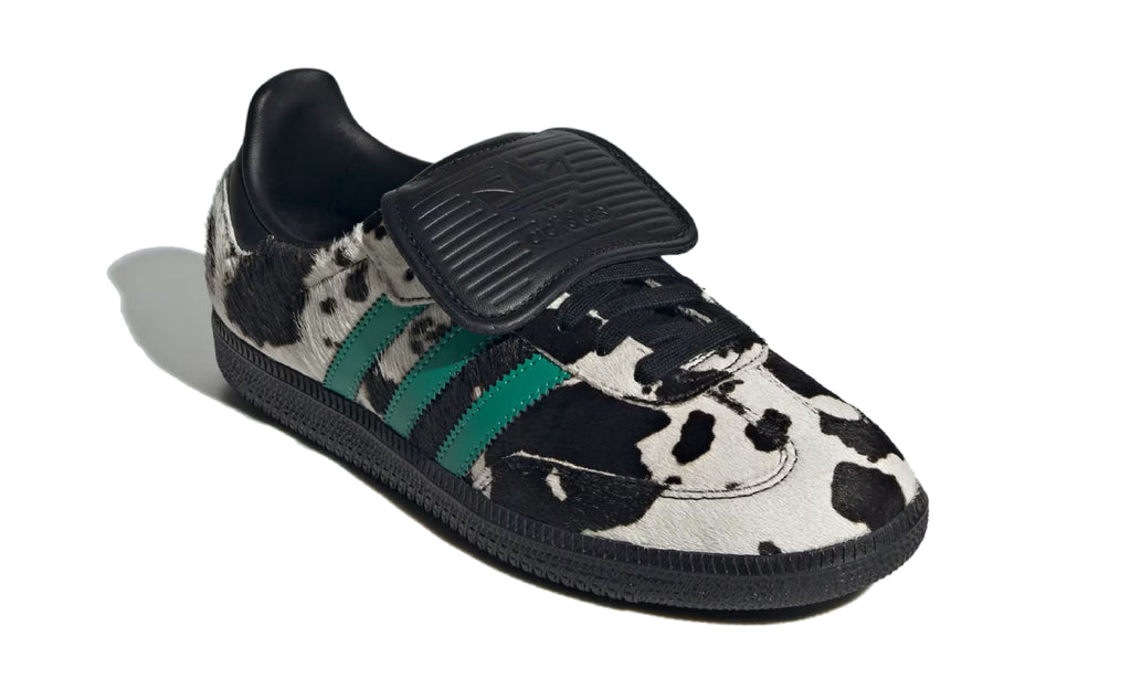Este modelo llama la atención con su exterior de peluche sintético en un llamativo estampado tipo piel de vaca en blanco y negro. Las 3 bandas en verde intenso rompen con el contraste monocromático y aportan un toque vibrante. El talón de cuero liso y la lengüeta plegable elevan el diseño con un acabado de calidad, mientras que la suela de goma negra ofrece firmeza y tracción. Una mezcla atrevida de texturas y colores que sorprende por lo bien que funciona.
