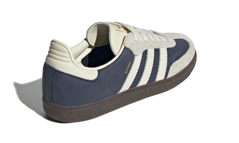 Los tonos Cream White envuelven las 3 rayas dentadas en los laterales para destacarse sobre la base de cuero Night Indigo. La puntera en T de gamuza luce tonos Cream White para complementar la lengüeta del talón en el extremo opuesto. Los detalles en dorado brillante animan el estampado del trébol de adidas en la lengüeta y el texto "Samba" en la sección lateral. Una suela de goma oscura ancla la parte superior, manteniéndose fiel a su marco liviano y suelas con agarre.