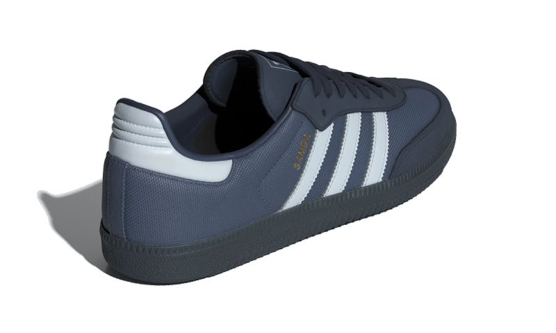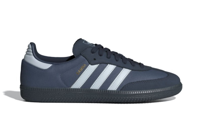 adidas Samba OG Preloved Ink Halo Blue presenta un color azul marino que combina un calzado elegante. La parte superior está hecha de un tejido repelente al agua que puede soportar la llovizna que se avecina y una capa de nobuk. Las tres rayas dentadas y la lengüeta del talón se combinan con un azul pastel para un acabado elegante.