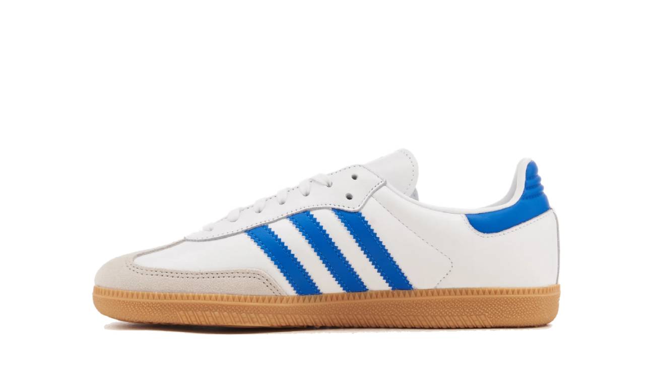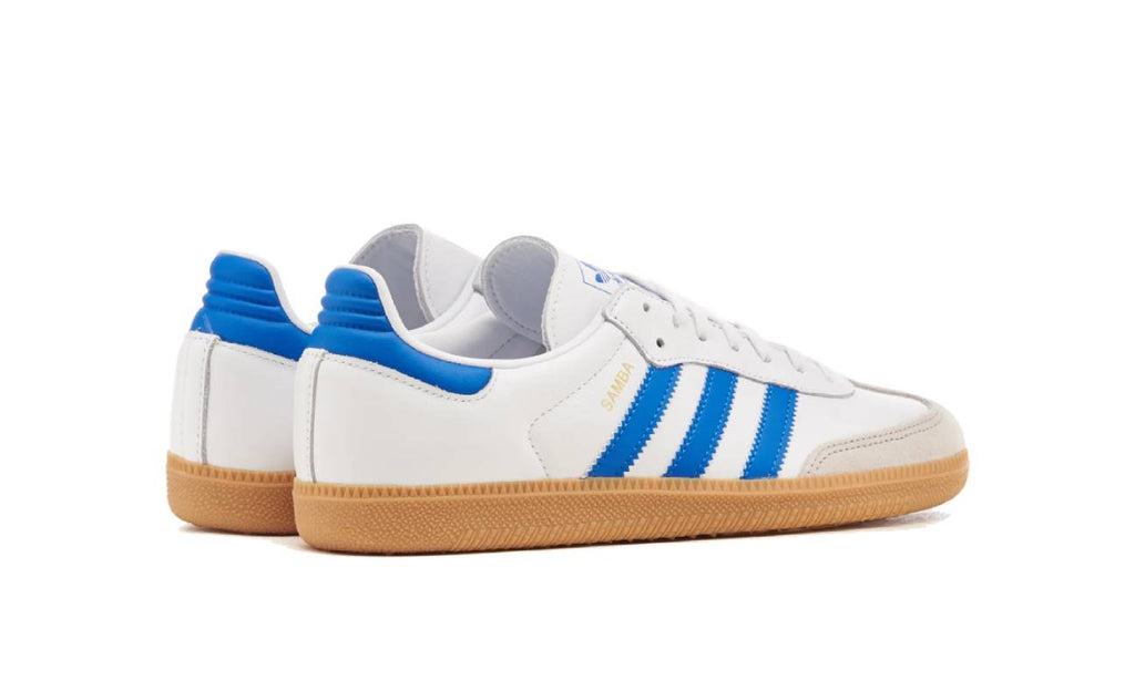 adidas Samba OG White Blue presenta un upper de cuero blanco con una superposición de nubuck gris en la puntera y la pestaña trasera. Los tonos azules envuelven las Tres Rayas serradas en el lateral, complementados por el logo Trefoil impreso en la lengua y el “Samba” en la pared lateral. Las plantillas acolchonadas ofrecen comodidad para el uso diario, mientras que la suela de goma proporciona tracción.