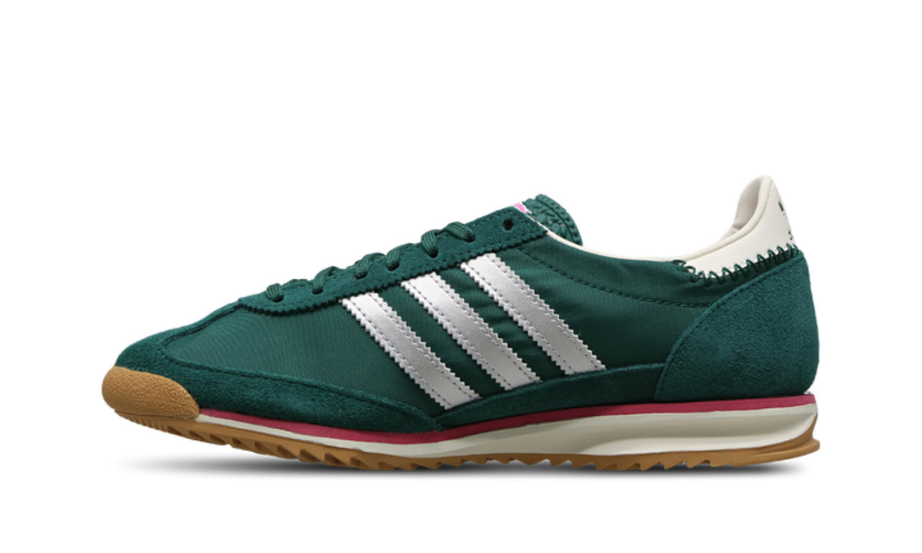 adidas SL 72 OG Preloved Green tiene una parte superior de nailon verde oscuro con delicadas capas de gamuza en la puntera, los ojales y el talón.