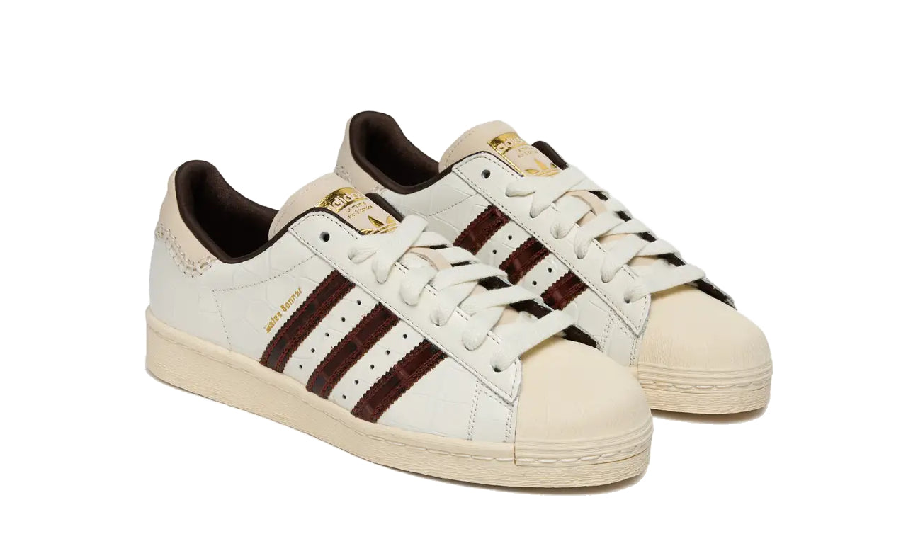 El modelo luce una parte superior de piel con textura de cocodrilo y detalles marrones en las franjas y el forro satinado. El tono crema en la puntera de goma y la suela aporta un aire vintage, mientras los logotipos dorados de Superstar y Wales Bonner añaden un toque de lujo. Las costuras visibles en el talón de nobuk rinden homenaje a las raíces afroatlánticas de la diseñadora. Incluye una caja especial, cordones extra y bolsa con cordón.
