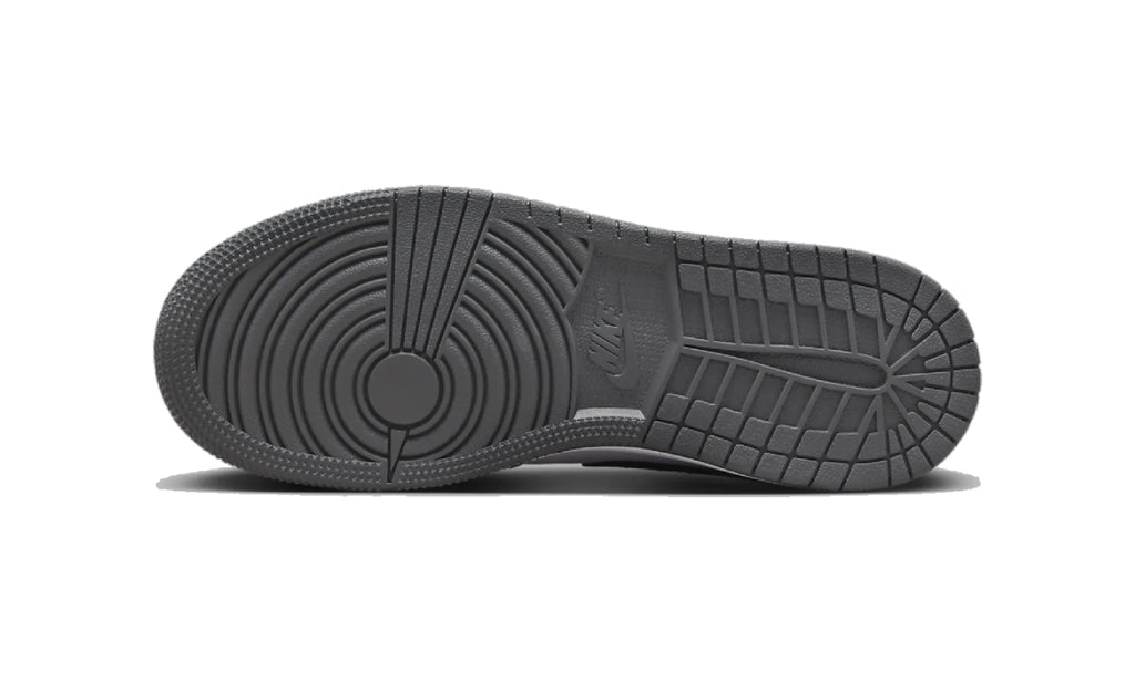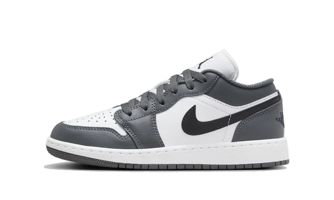 Air Jordan 1 Low Iron Grey están revestidas de cuero blanco en sus capas inferiores, como se ve en la puntera y el panel lateral. Otro toque blanco se ve en la lengüeta de malla de nailon.