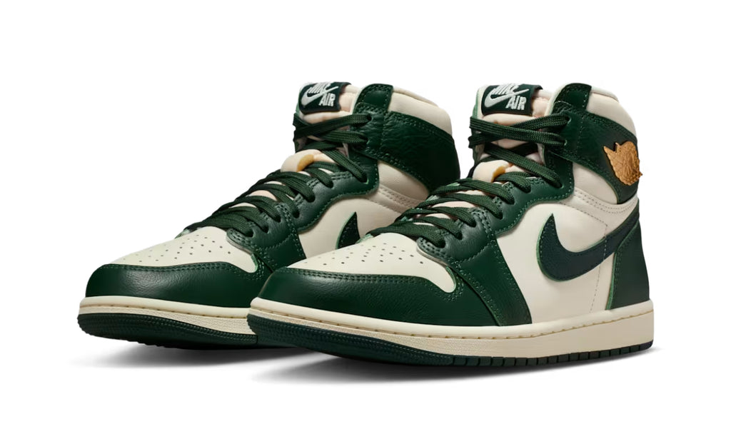 Esta nueva versión del AJ1 High llega como parte del 40 aniversario de la icónica línea Jordan. Presenta una base de cuero blanco con superposiciones en verde oscuro, acompañadas del Swoosh lateral, el logo Wings en el tobillo y el clásico “Nike Air” en la lengüeta. Las perforaciones en la puntera aportan ventilación, mientras que la unidad Air en el talón y la suela de goma garantizan comodidad y tracción en todo momento.