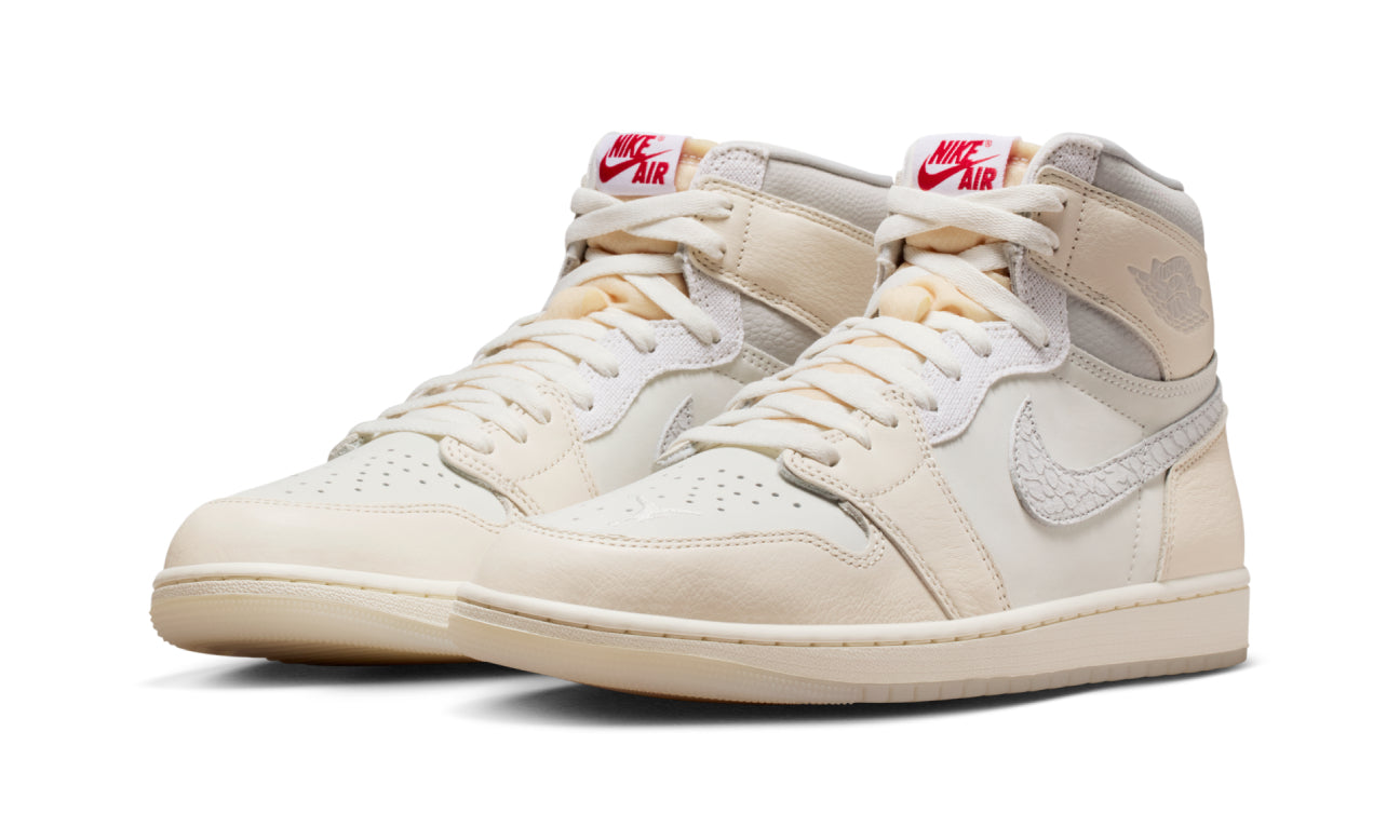El upper combina cuero color sail, detalles marfil y un Swoosh con estampado elephant, guiño directo a las AJ3. El cuello gris texturizado recuerda a las AJ2, mientras el branding Nike Air en rojo aporta contraste. Elementos como la lengüeta amarillenta, el logo Wings en relieve y la suela translúcida refuerzan su carácter retro. El par se presenta en una caja especial con gráficos elephant print, completando una propuesta cargada de historia.