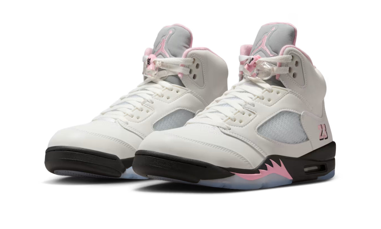 Apodadas “35th Anniversary”, las Air Jordan 5 “Medium Soft Pink” celebran el legado del icónico modelo de 1990 con un toque moderno y femenino. Presentan una parte superior de cuero blanco con paneles de malla transparente para mayor transpirabilidad y el número 23 bordado en el talón como guiño a Michael Jordan. Los detalles en rosa en los dientes laterales evocan los cazas de la Segunda Guerra Mundial, mientras el logo Jumpman en la lengüeta reflectante añade estilo. La unidad Nike Air visible en el talón garantiza amortiguación, y la suela translúcida completa este diseño con un aire fresco y conmemorativo.