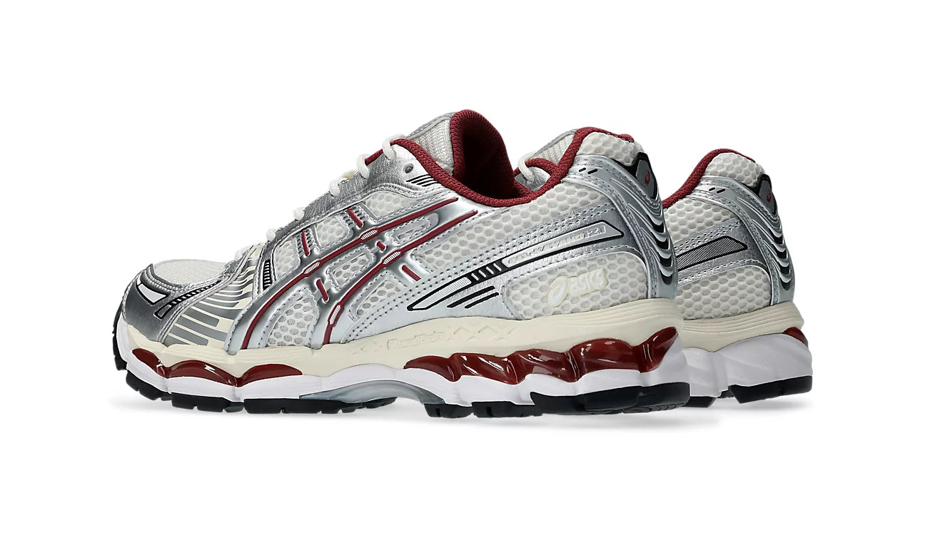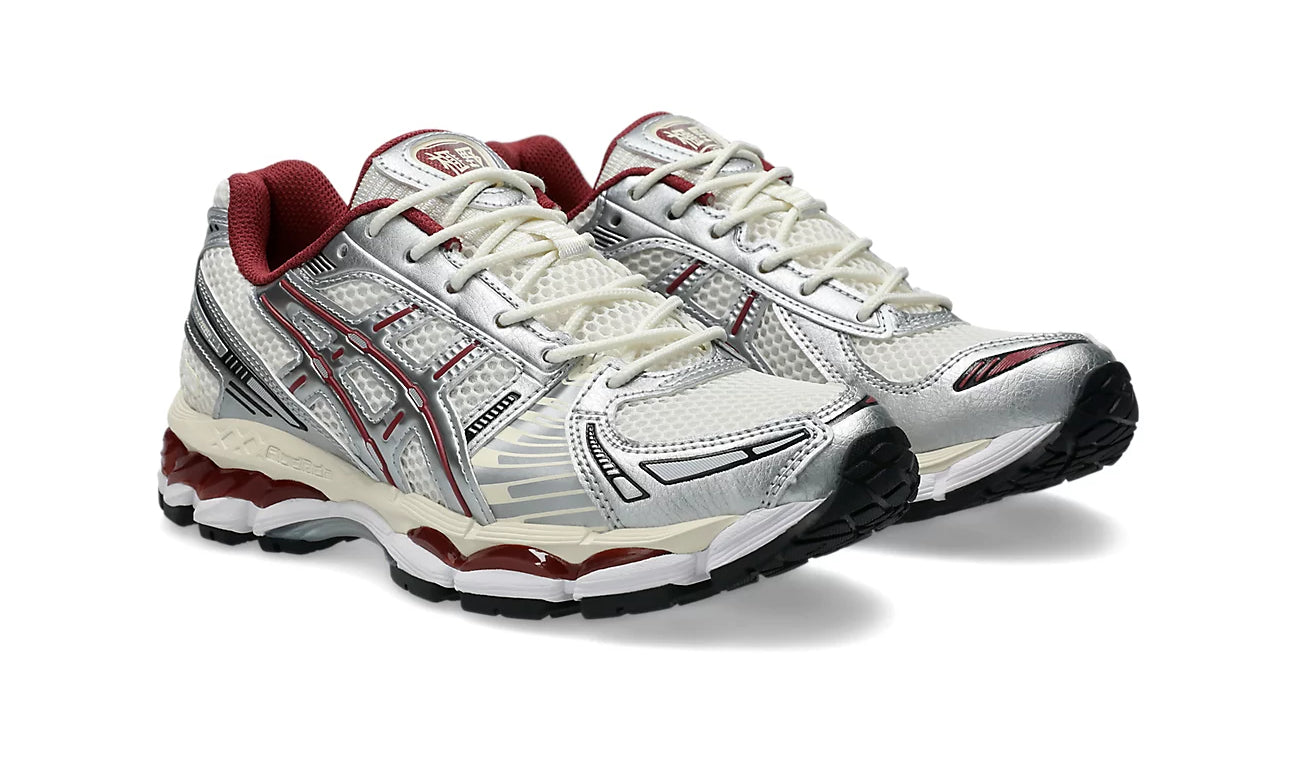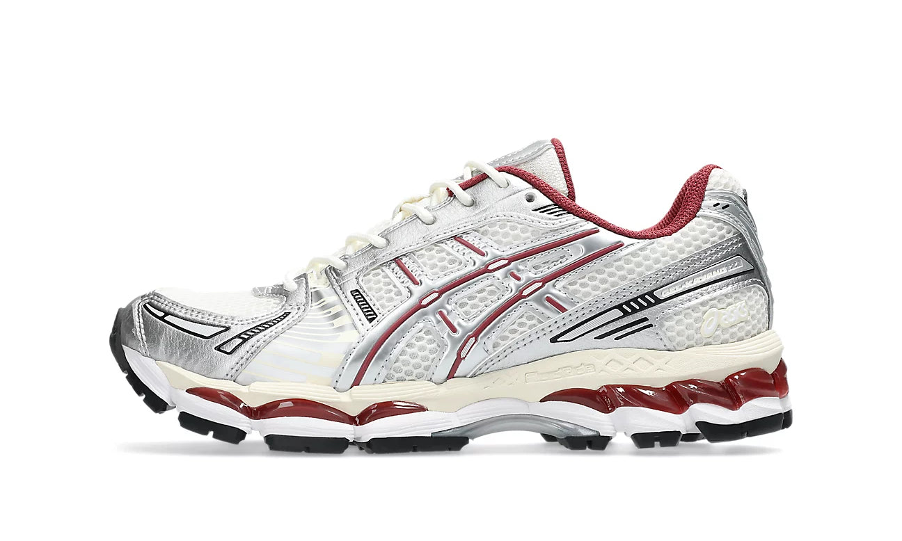 ASICS presenta las Gel-Kayano 12.1 “Silver Burgundy”, una silueta híbrida que combina estilo retro y tecnología moderna. Su parte superior de malla en tono blanco envejecido se mezcla con detalles plateados brillantes y acentos burdeos en las icónicas Tiger Stripes y el forro interior.