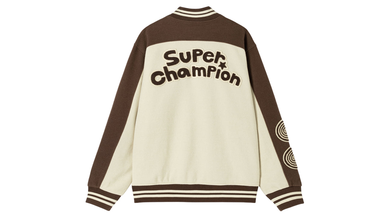 La CHAMPION x POP MART “SUPER CHAMPION” MOLLY fusiona el estilo deportivo clásico con el arte contemporáneo. Esta chaqueta varsity presenta una base en tonos beige y marrón, con detalles bordados que incluyen el logotipo de Champion y el icónico personaje MOLLY, símbolo de creatividad y cultura pop.