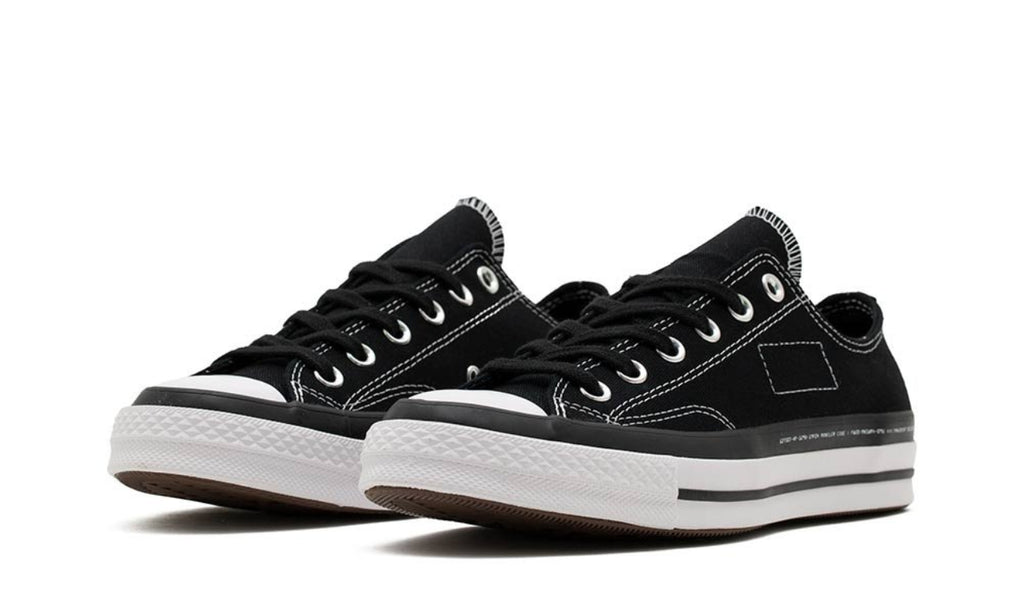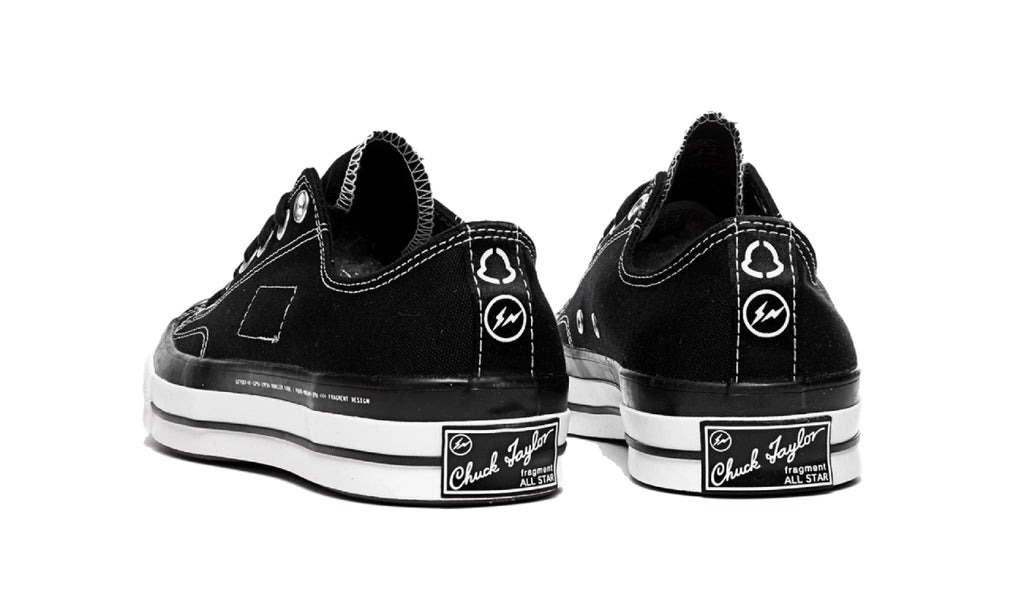 Las Chuck 70 se mantienen fieles al diseño original, están envueltas en negro y confeccionadas con el tejido de lona duradero característico de la marca de calzado tradicional. Las costuras en contraste y los ojales de metal en tono plateado adornan la parte superior, mientras que la marca en tres direcciones, incluido el logotipo del rayo característico de Fragment, está grabado en relieve en las lengüetas del talón para una apariencia premium.