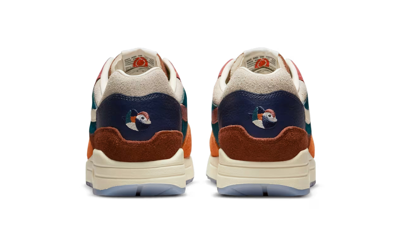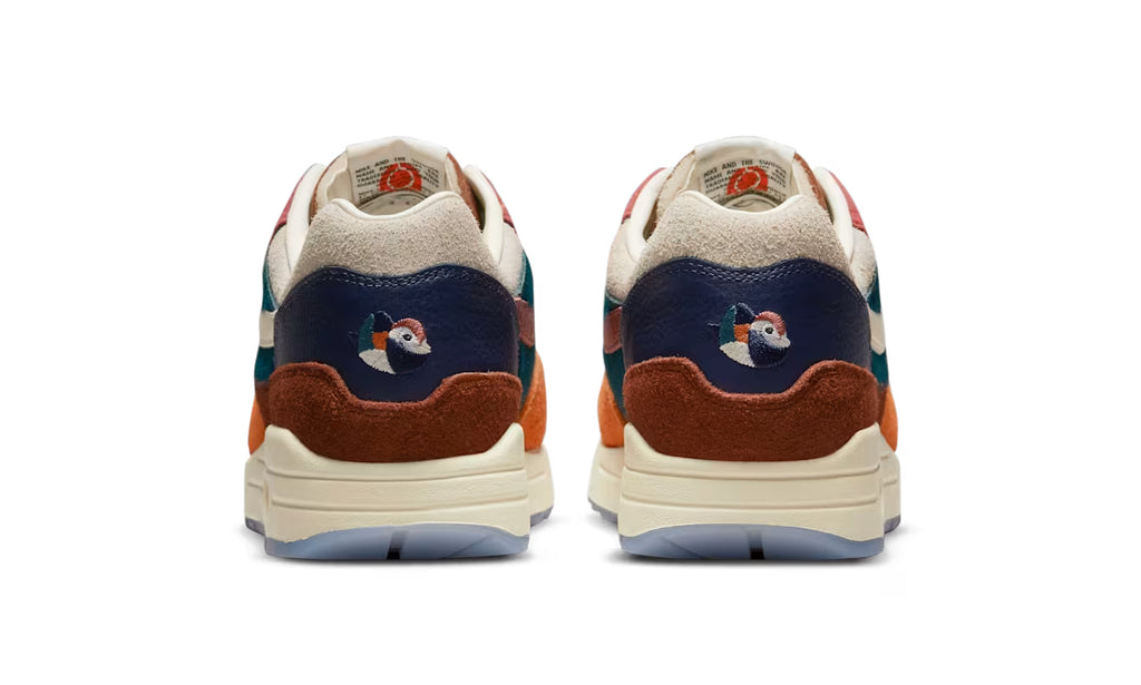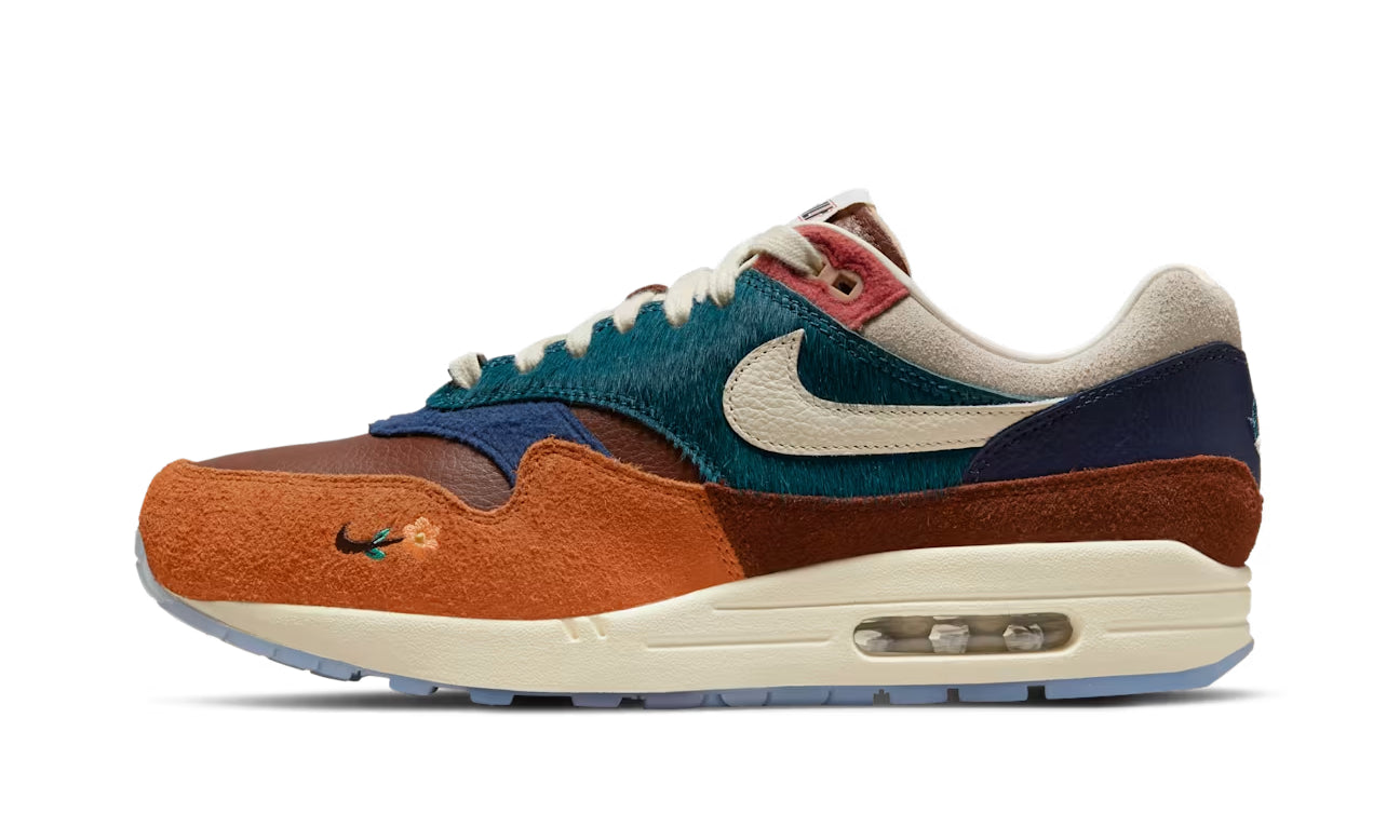 Kasina x Nike Air Max 1 Blue Orange combina colores vibrantes y texturas únicas, desde cuero y ante burdeos y naranja hasta pony hair azul océano. Destacan ojales de madera desparejados, lengüetas con branding Kasina y mini Swooshes bordados. Incluye hangtag bordado con diseño de pato, entresuela crema con Air visible y suela azul translúcida, cerrando un estilo lleno de detalles.