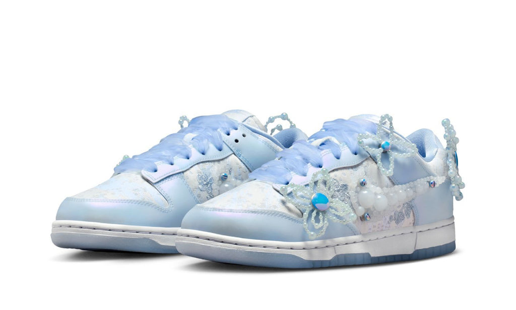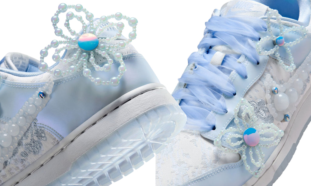 La silueta combina encaje blanco sobre una base textil con superposiciones en azul claro y un Swoosh formado por perlas brillantes. Detalles florales en 3D y cordones tipo cinta aportan un toque romántico y artístico, mientras la suela translúcida completa el diseño con una frescura delicada y moderna.