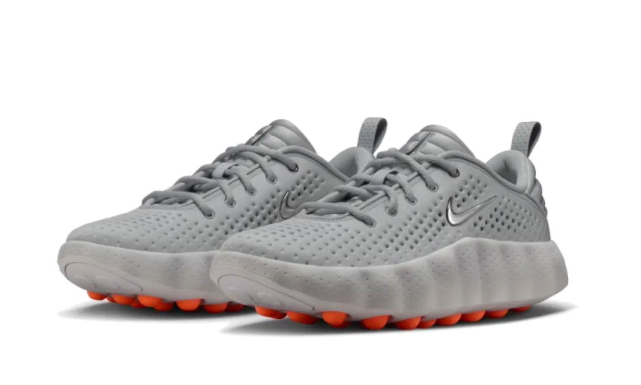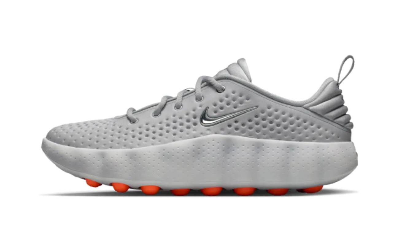 Las 002 lucen un upper de tejido knit gris con perforaciones diseñadas para ofrecer ligereza y transpirabilidad. Un Swoosh en plata metálica se sitúa en la lengüeta acolchada y en el lateral, complementando el branding Nike cromado en la parte trasera. El sistema de cordones tradicional y el contrafuerte acolchado del talón garantizan un ajuste seguro. La entresuela de espuma voluminosa proporciona excelente amortiguación y absorción de impactos bajo el pie. Además, 22 nodos esféricos de espuma en color naranja se enfocan en los puntos de presión del pie de adelante hacia atrás, ofreciendo una experiencia sensorial única en cada paso. Esta versión se presenta en una caja especial con gráficos científicos en el papel envolvente.