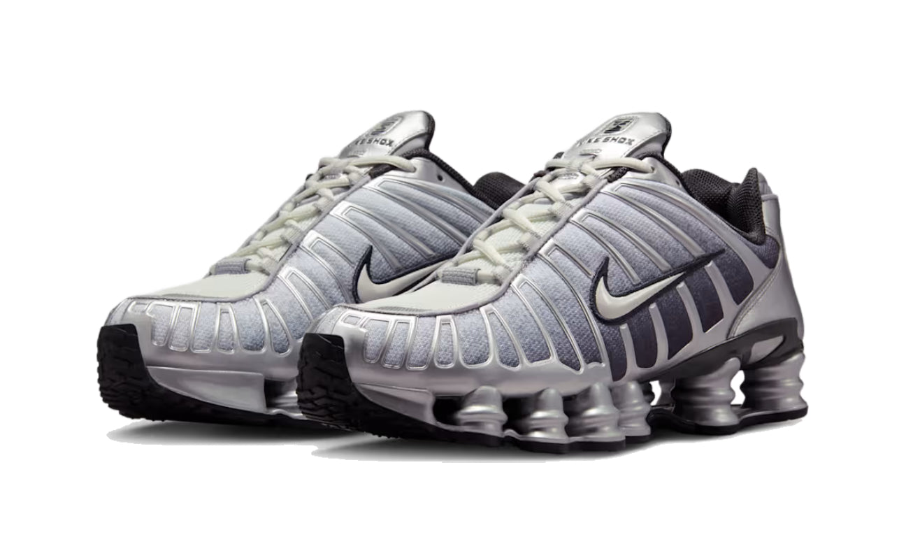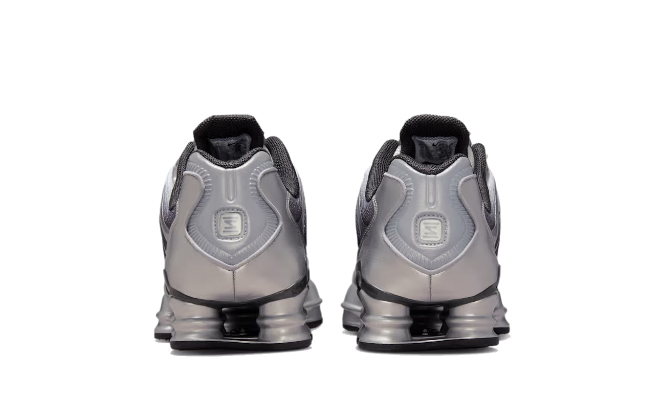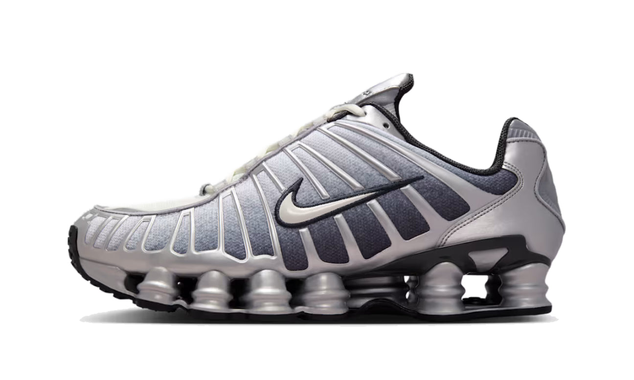 Nike Shox combina estética futurista y herencia retro en una silueta que brilla con detalles “Metallic Silver” en el talón, los refuerzos y los icónicos pilares Shox. Su parte superior de malla muestra un degradado entre “Wolf Grey” y “Anthracite”, evocando un cielo tormentoso, mientras el blanco en la lengüeta y la puntera aporta un toque limpio y moderno.
