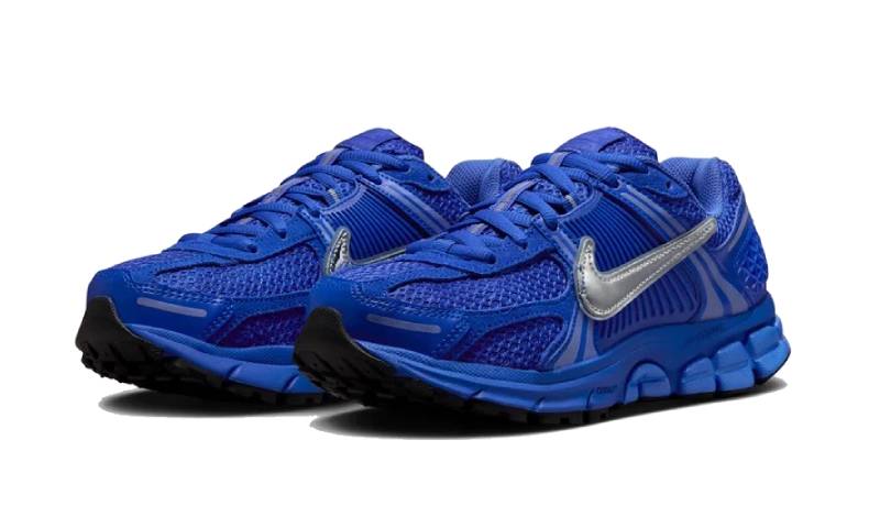 El Zoom Vomero 5 presenta un modelo familiar, que combina malla transpirable con superposiciones de cuero para brindar soporte. Los ojales de gamuza añaden sofisticación, con elementos reflectantes de 3M y logotipos Swoosh plateados metálicos que muestran una artesanía meticulosa. El diseño incluye una jaula de plástico distintiva, superposiciones en el talón y una entresuela de dos tonos sobre una suela de goma negra duradera.