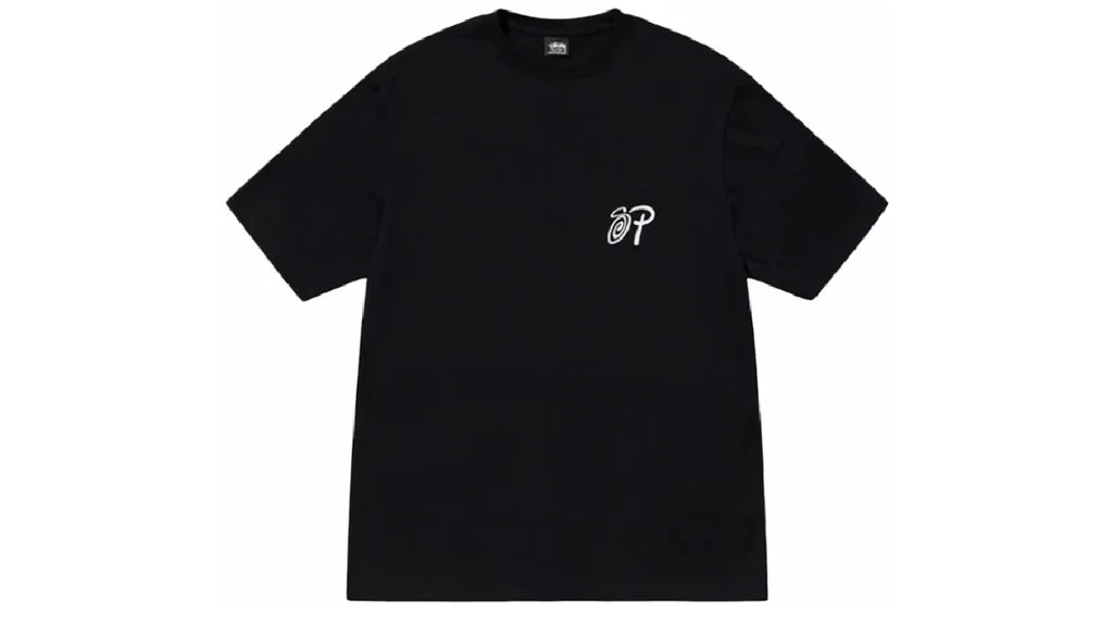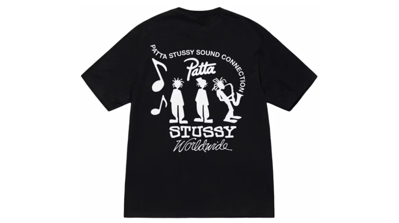 Una colaboración icónica entre Patta y Stussy, esta camiseta negra de algodón presenta un diseño frontal minimalista con las iniciales estilizadas “OP” y una parte trasera llena de energía musical. El gráfico en la espalda muestra figuras animadas con notas musicales y las frases "Patta Stussy Sound Connection" y "Stussy Worldwide", celebrando la cultura callejera y la música global.