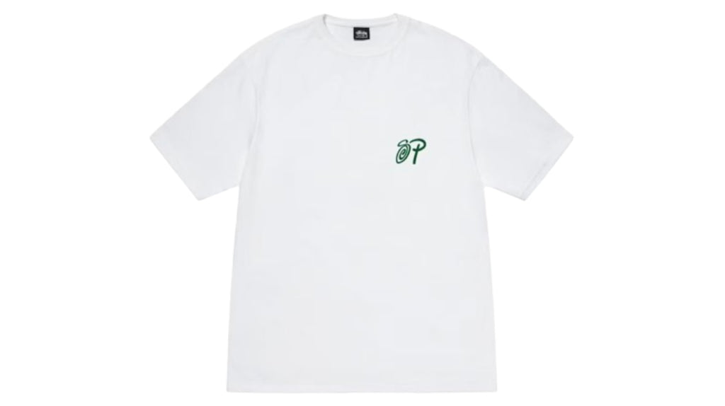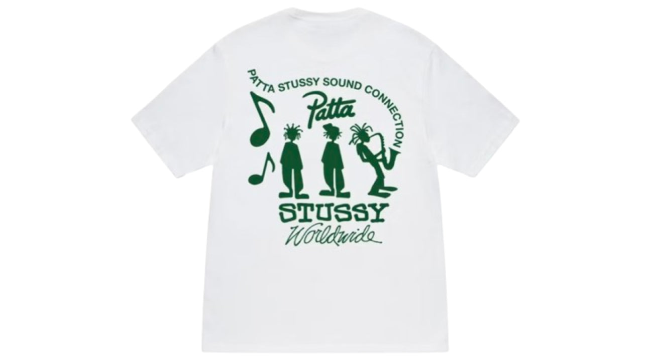 Una colaboración icónica entre Patta y Stussy, esta camiseta blanca de algodón presenta un diseño frontal minimalista con las iniciales estilizadas “OP” y una parte trasera llena de energía musical. El gráfico en la espalda muestra figuras animadas con notas musicales y las frases "Patta Stussy Sound Connection" y "Stussy Worldwide", celebrando la cultura callejera y la música global.