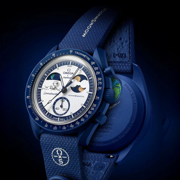 Este es el Swatch x Omega Bioceramic Moonswatch Mission to the Moonphase "Snoopy" Moonshine Gold, un reloj que combina el diseño icónico del Speedmaster con un toque lúdico gracias a Snoopy en la fase lunar.