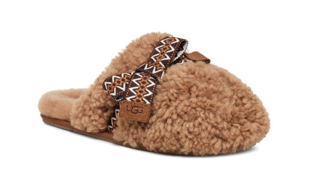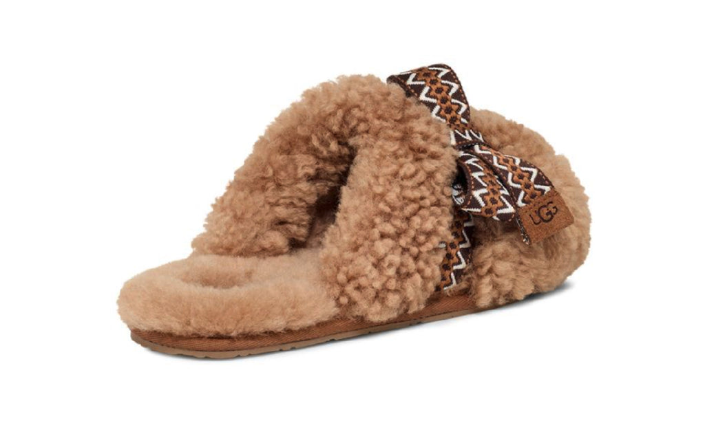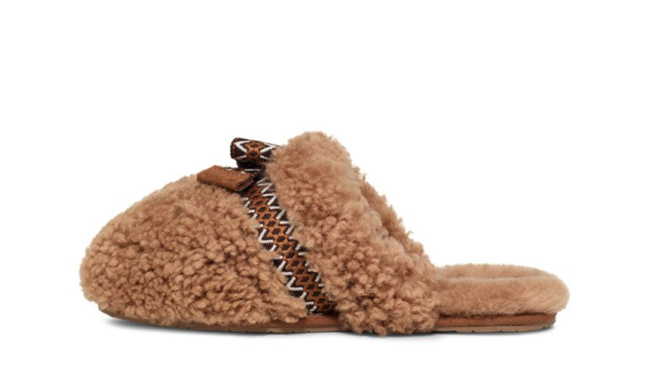 UGG Maxi Curly Sister Slide Chestnut es una zapatilla nacida para las fiestas y que utiliza el clásico tejido UGGbraid para la parte superior.
