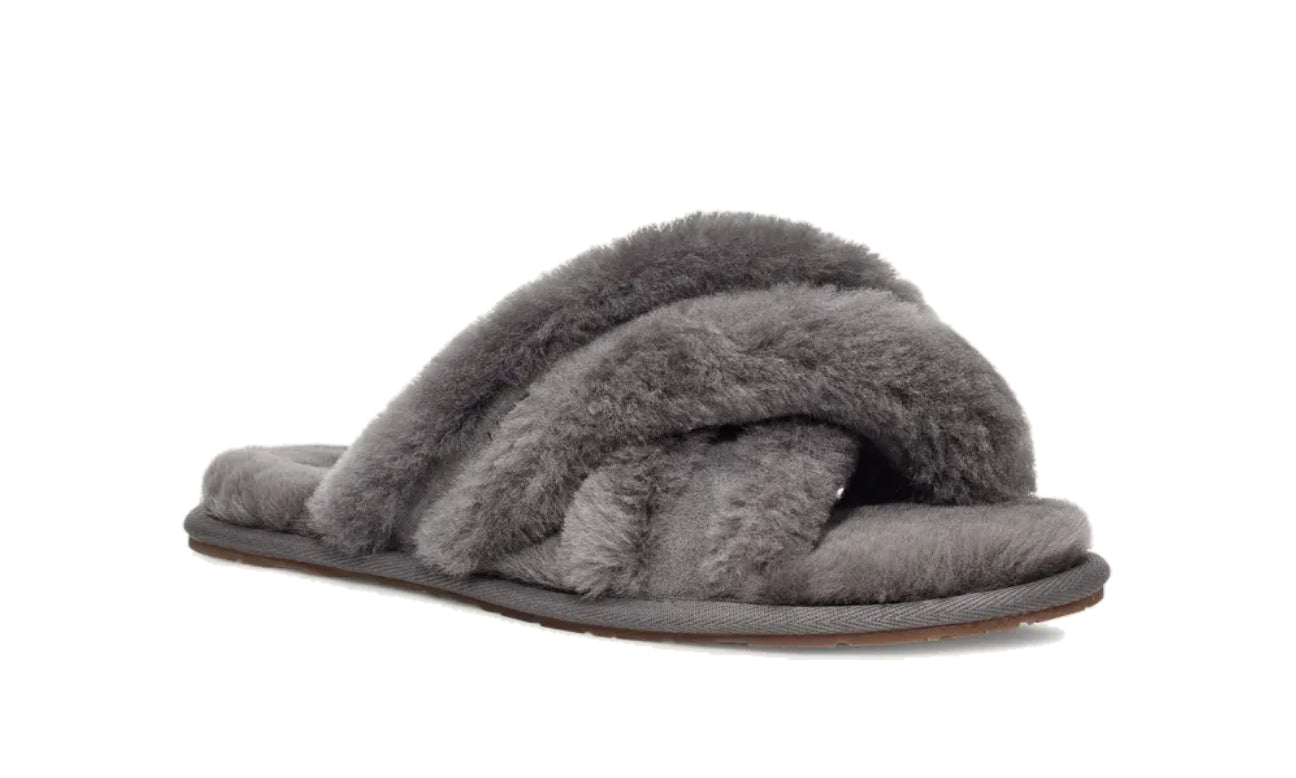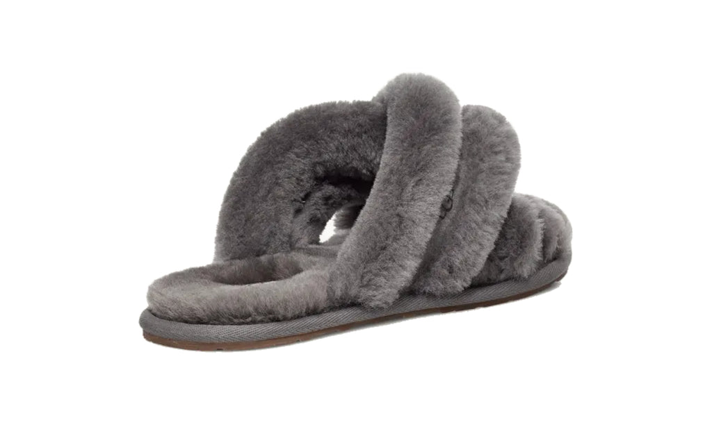 UGG Scuffita slippers Charcoal con su suave piel de oveja y una suela de goma moldeada. Las suaves tiras cruzadas y las capas de ante le dan a este modelo un toque femenino. Ribete textil fabricado en fibras de poliéster 100 % reciclado y etiqueta tejida con el logotipo de UGG® en la plantilla, logo UGG® termograbado. Este producto se fabrica en una fábrica que apoya a las mujeres de nuestra cadena de suministro con la ayuda del proyecto HERproject.