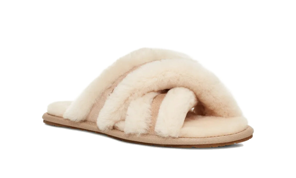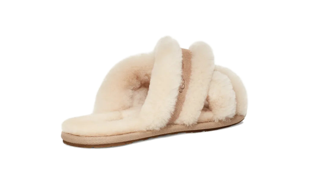 UGG Scuffita slippers Sand con su suave piel de oveja y una suela de goma moldeada. Las suaves tiras cruzadas y las capas de ante le dan a este modelo un toque femenino. Ribete textil fabricado en fibras de poliéster 100 % reciclado y etiqueta tejida con el logotipo de UGG® en la plantilla, logo UGG® termograbado. Este producto se fabrica en una fábrica que apoya a las mujeres de nuestra cadena de suministro con la ayuda del proyecto HERproject.